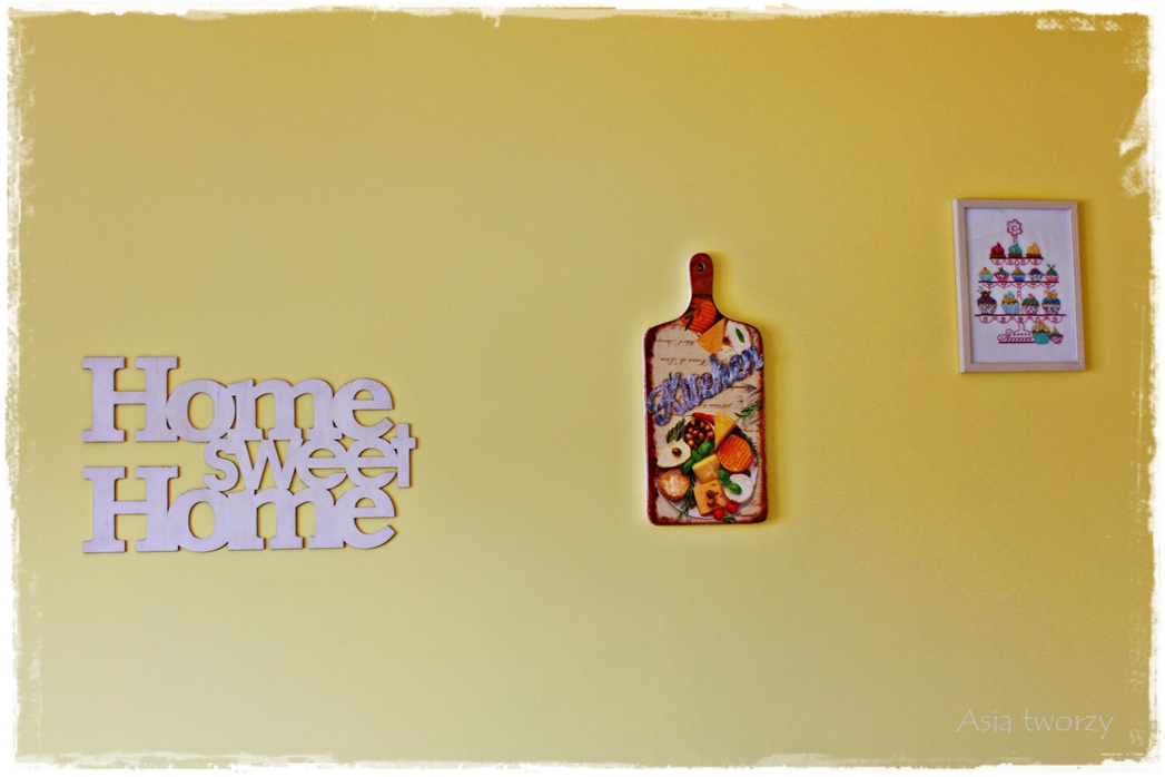 Ściana zaczyna nabierać swojskiego klimatu, bo poza napisem mamy tu jeszcze deskę serów oraz haftowane babeczki z wymianki :) Uznałam, że kuchnia nabrała charakteru dzięki tej ścianie z rękodziełem :) Musicie mi uwierzyć na słowo, jest super :)
